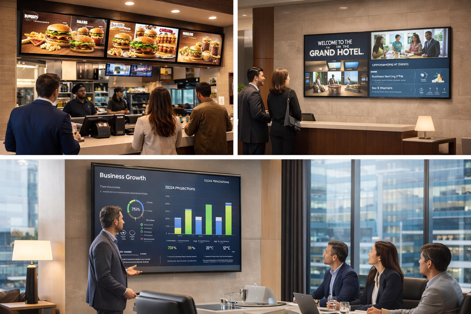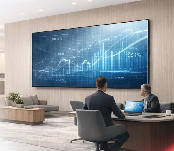 Displays profesionales para presentaciones, dashboards de datos y comunicación interna.
